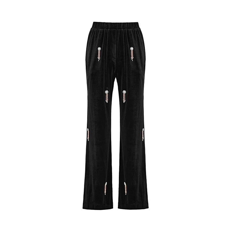 Upgrade your style with our stunning Black Velvet Crystal Blazer & Pants Set. This elegant ensemble features a luxurious black velvet fabric adorned with shimmering crystals, adding a touch of glamour to any occasion. Perfect for formal events or a night out, this set exudes sophistication and timeless charm. Shop now and make a statement with this exquisite outfit.