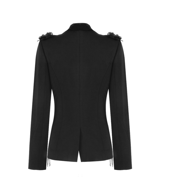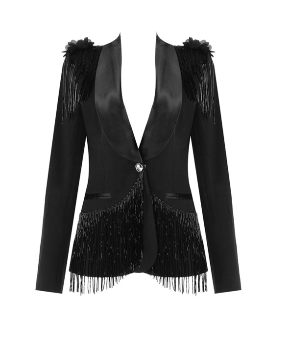 Get ready to turn heads in our Darlene blazer! Featuring a flower detail on the shoulders and fringe detail for a chic look! Style with black pants and heels for a look we're obsessed with!