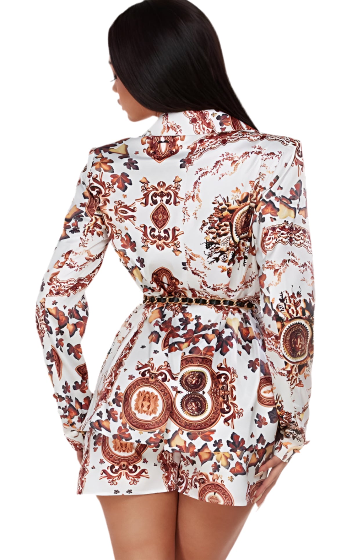 Style up with our Floral Bronze Blazer Leather Chain Belt Shorts Set. This chic ensemble features a tailored floral blazer paired with trendy shorts, accentuated by a sophisticated leather chain belt. Perfect for day-to-night transitions, this set combines elegance and comfort for any occasion. Make a statement with this must-have addition to your wardrobe.