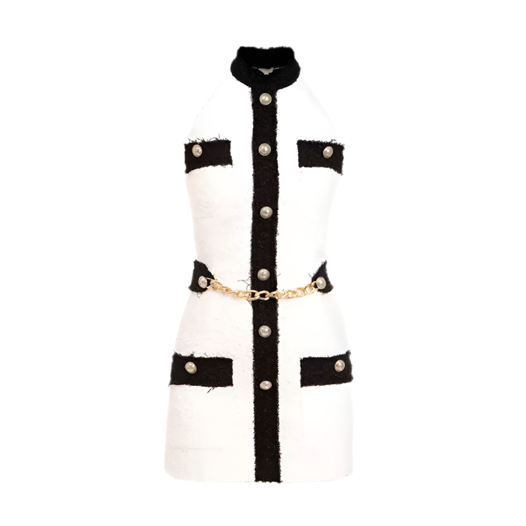 Tweed Black + White Halter Gold Buttons Mini Dress